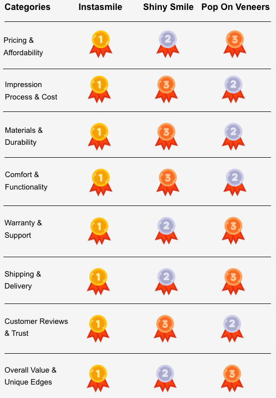When comparing Instasmile to competitors like Shiny Smile and Pop On Veneers, the difference comes down to innovation, reliability, and real-world results. Instasmile leads in every key area that matters to customers — from comfort and durability to price transparency and customer satisfaction.